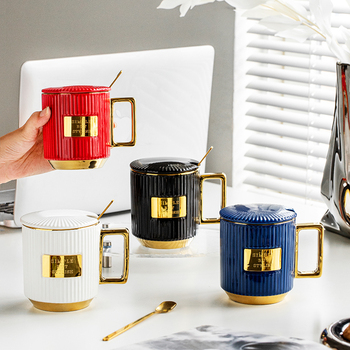 יוקרה סובלימציה נורדי ספלי עם מכסה וכף זהב ידית פורצלן קפה גביע זהב גלוון מתכת תג ספל
